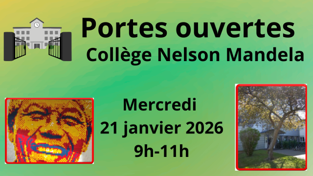 La Direction, l’équipe pédagogique et l’Association des Parents d’Élèves ont le plaisir de vous inviter à la Journée Portes Ouvertes du collège Nelson Mandela qui se déroulera le mercredi 21 janvier 2026 de 9h00 à 11h00